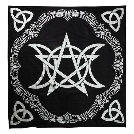 Beautiful black cotton Altar Cloth with metallic silver print, featuring an elegant Triple Moon entwined with a Pentagram and Triquetra corners