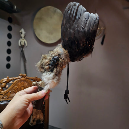 This stunning Ceremonial Smoking (Smudging) Fan has been crafted with a complete, preserved Duccle wing, on a beautiful piece of natural Driftwood and I have adorned it with some ethically sourced Rabbit fur, bound with leather and Kangaroo leather strapping over a beautiful natural Smokey Quartz point. I've also attached a couple of Lava Stone beads onto the dangling kangaroo leather.