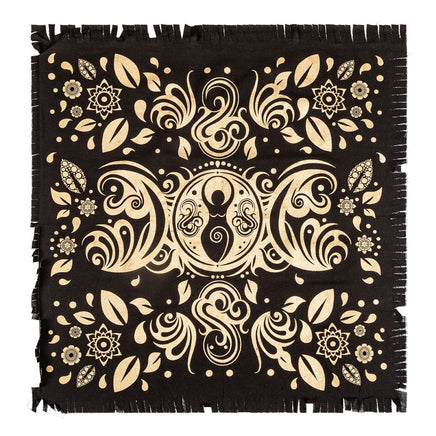 Black Altar cloth, thinner fabric, gold & silver metallic printing of Goddess symbol with botanical/floral pattern design.