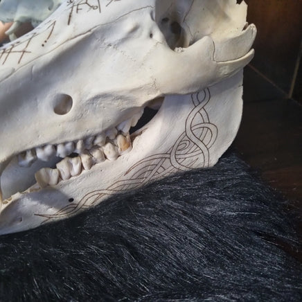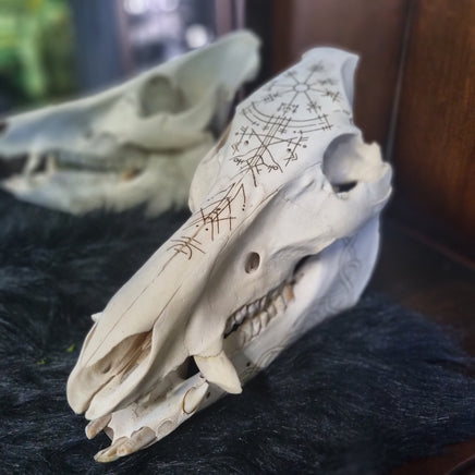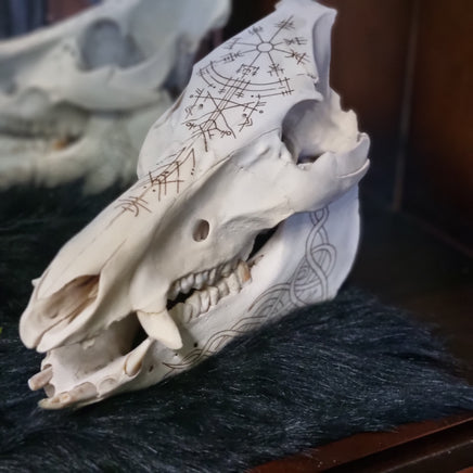 This awesome boar skull has been pyrographed by hand and features the Nordic Vegvisir, bindrunes and Nordic knotwork.