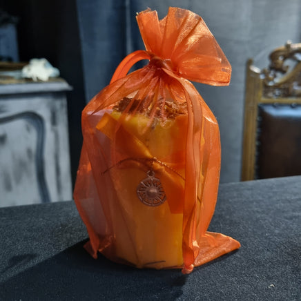 Our Success Candles are made with pure Orange (sweet) and Sandalwood essential oils and are topped with our organic herbal blend for Success & Wishes. A matching charm (Sun, Bee or Lucky Clover etc.) is then added to the copper or gold cord/ribbon to adorn each candle. All of our ingredients and colours are chosen for their spiritual and magickal properties appropriate to the candle.