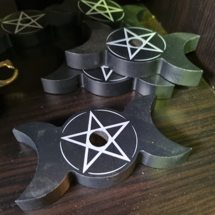 Black painted wood candle holder with pentacle/pentagram painted in centre.