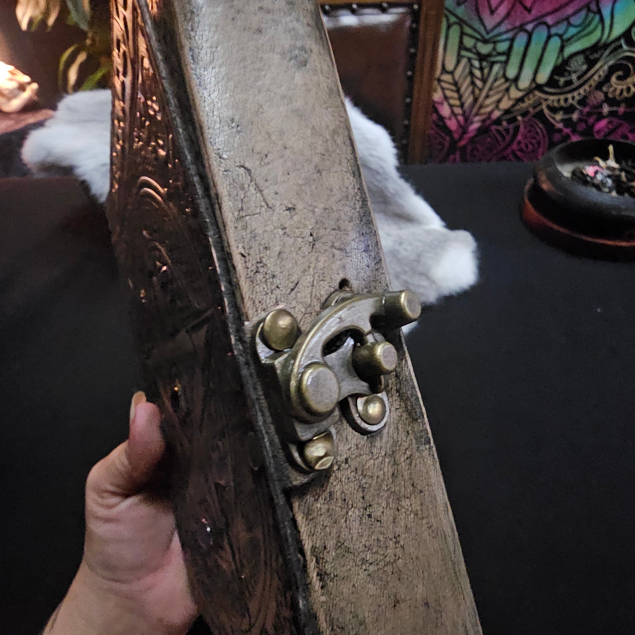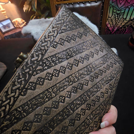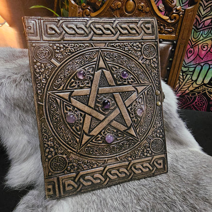 Leather journal with embossed Pentacle and knotwork design on front cover and patterns on the back. Has purple stones (appear to be Amethyst, though unsure of quality to be honest - still pretty though)
