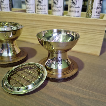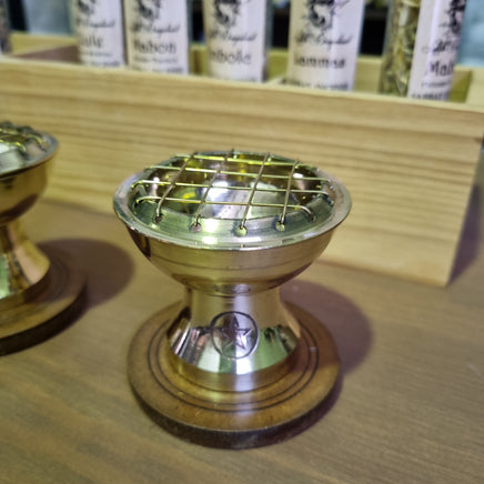 Small goldtone charcoal burner, with cage top, carved pentacle/pentagram and a little wooden coaster-style base.