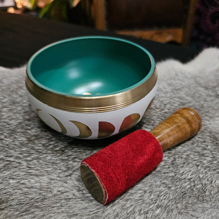 White, Aqua & Gold Singing Bowl. Has moon phases printed in gold. Comes with stick.
